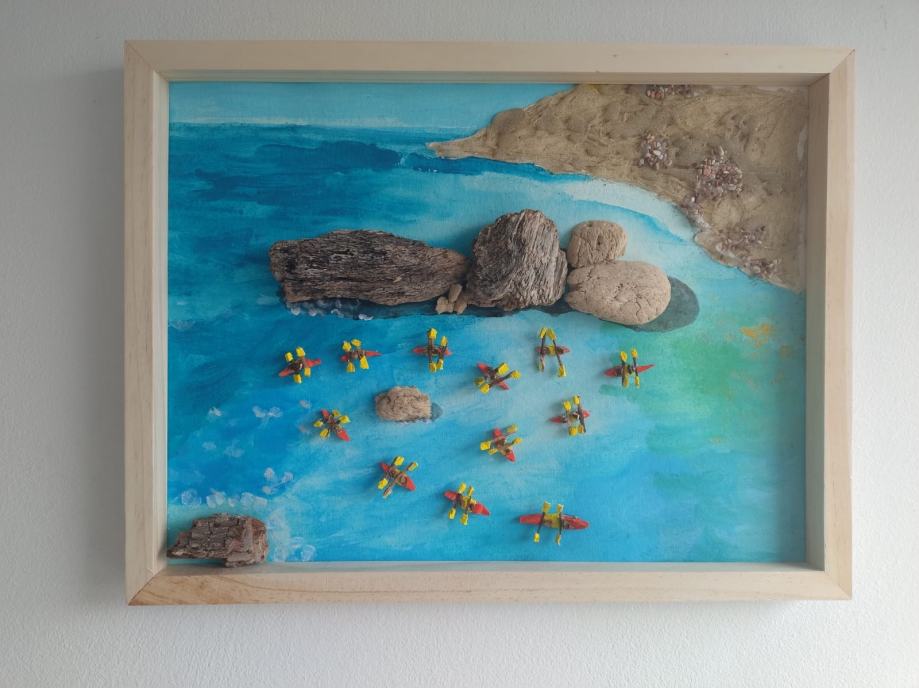 Slika je nastala inspirirana prizorom kajaka na moru i naplavinama koje su pronađene na obalama mora.Dimenzija slike je 32 × 42 cm sa okvirom a bez okvira 30×40cm.