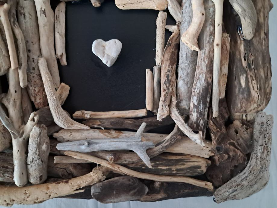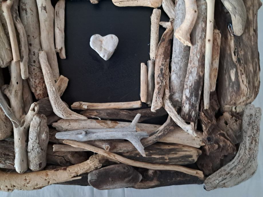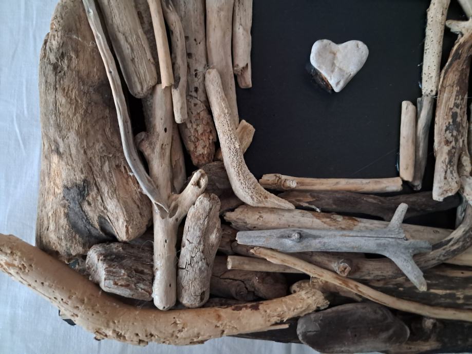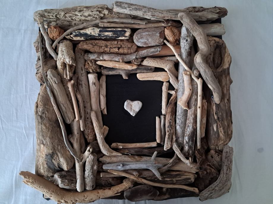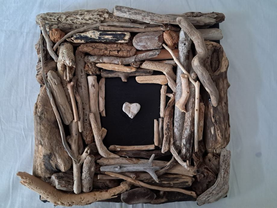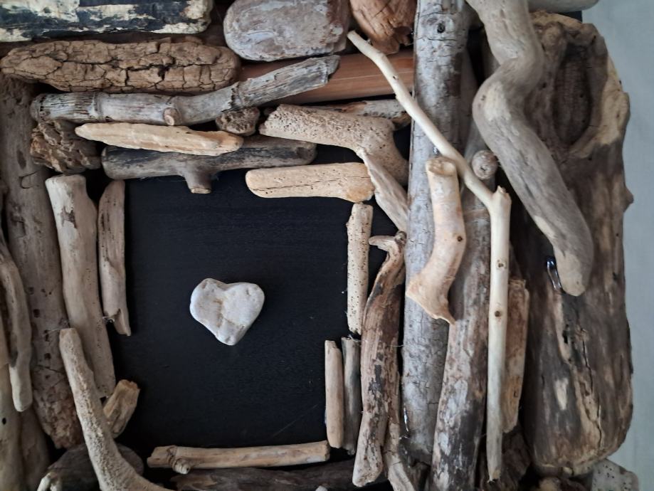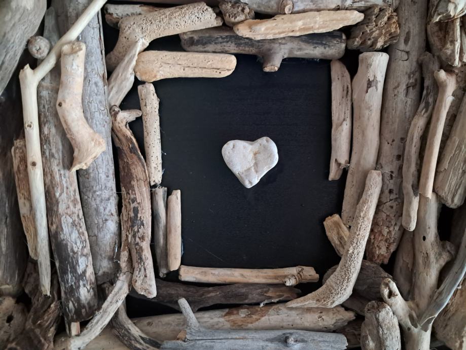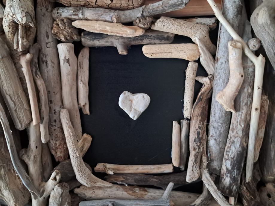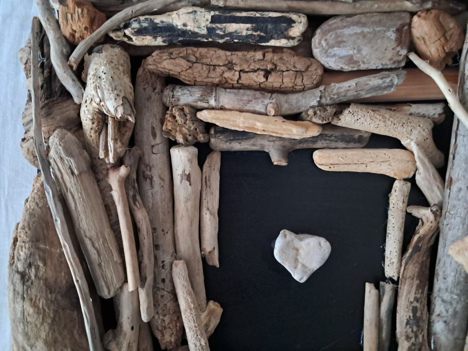 Ova impozantna slika izrađena je od naplavina sa morske obale zajedno sa pronađenim kamenim srcem.Dimenzija slike je 33 × 33 cm