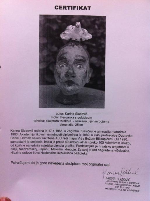 uz skulpturu dobivate certifikat autentičnosti. (s potpisom i pečatom autorice)
