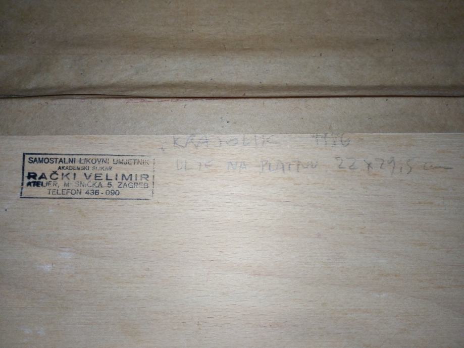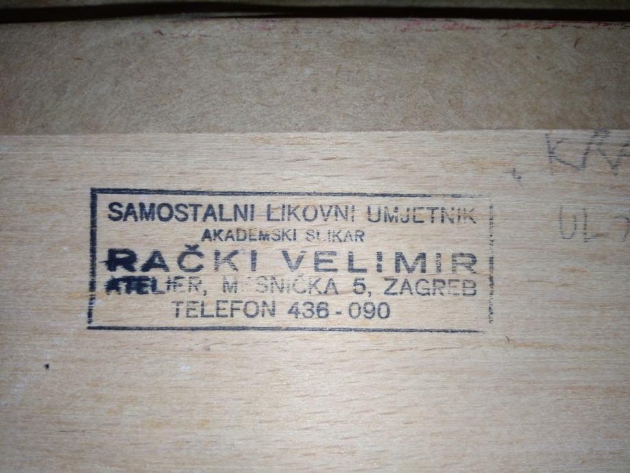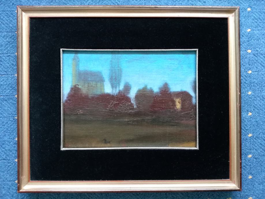 Krajolik 1986 naslikano uljem na platnu dimenzija 22 x 29,5 cm, majstora Velimira Račkog.