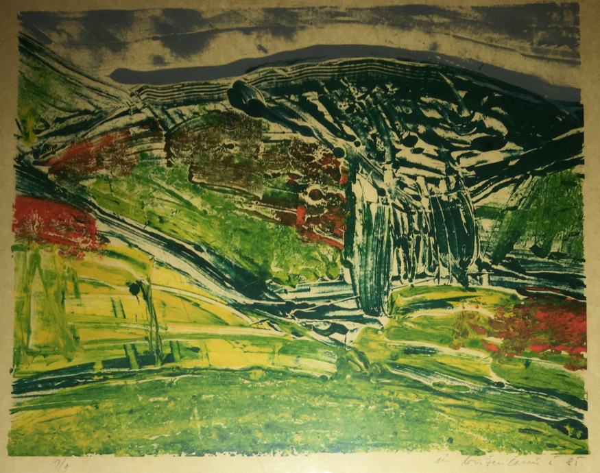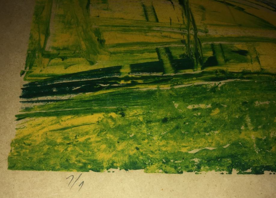 Monotipija (1/1) iz 1985.g. s motivom pejzaža slikara Križničanina. Uokvireno i ostakljeno. Dimenzije s okvirom su 48x42cm.