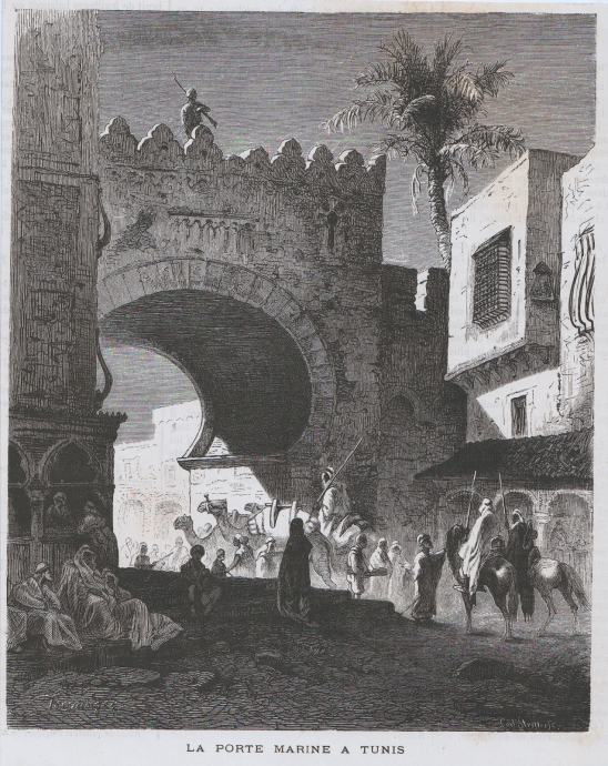 Motiv: Ulaz u staru medinu Tunisa, svakodnevni život – trgovci, prolaznici, jahači, arhitektura osmanskog razdoblja