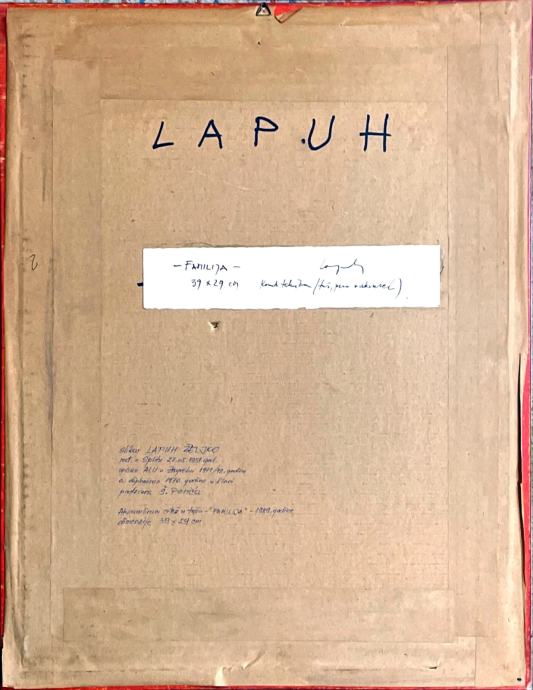 Slika akademskog slikara ŽELJKA LAPUH - "FAMILIJA" izrađena je u tehnici crteža tušem i akvarela, a nastala je 1989.godine. Dimenzije slike su: 39 x 29 cm, a dimenzije s okvirom su: 53,5 x 44,5 cm. Okvir je originalan i iz vremena nastanka slike.