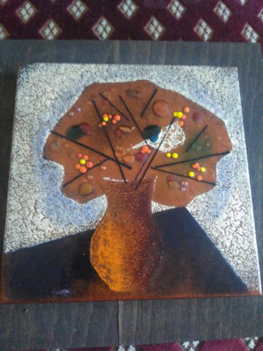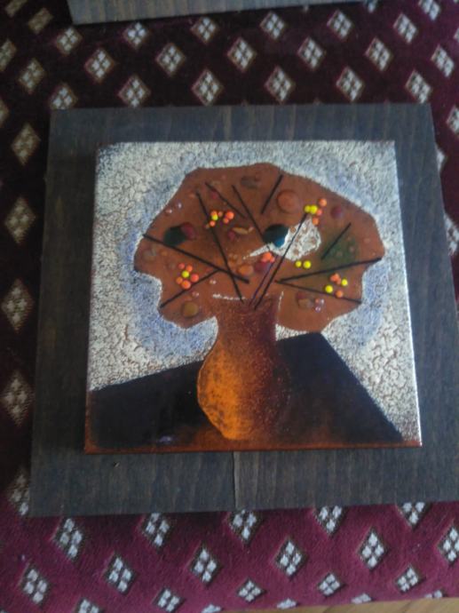 16 x 16 cm a s drvenom podlogom 22 x 22 cm. Unikat, potpisano od autora