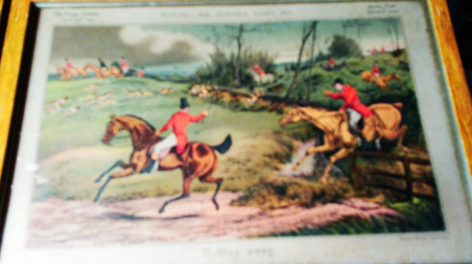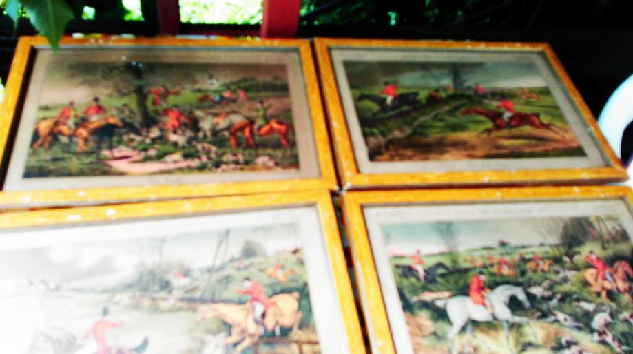 četiri originalne engleske litografije iz 1891 godine sa motivoma iz lova.originalna rama, otraga naljepnica majstora iz Londona koji je uokvirio sliku. cilena po komadu 300kn. još jedna litografija sa istim motivom novijeg datuma. cijena 200kn