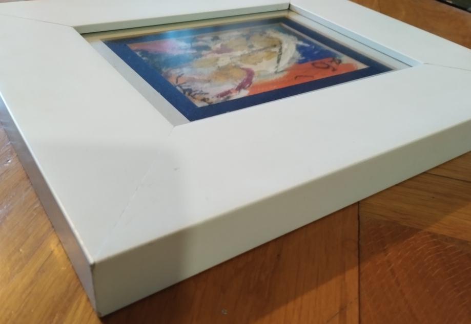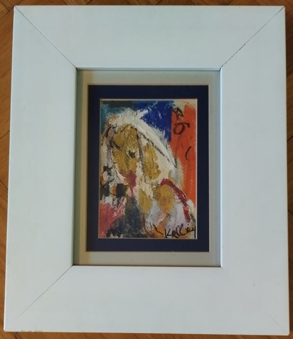 Izvrsna apstrakcija (akril na kartonu) hrvatske slikarice Ljerke Kallay. Uokvireno u masivni moderni okvir s antirefleksnim staklom. Dimenzije s okvirom 35x30cm (unutar paspartua 15x10cm).