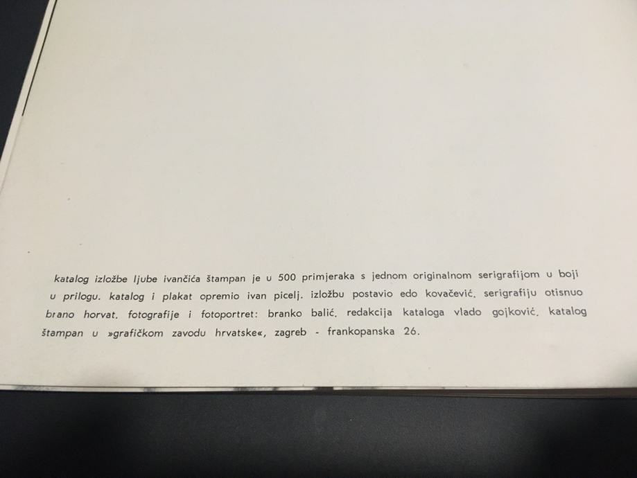 Katalog je izdan u 500 primjeraka (tiskan u Grafičkom zavodu Hrvatske), a serigrafija je rađena u čuvenom studiju Brane Horvata, u kojemu su svoje grafike radili gotovo svi najznačajniji hrvatski umjetnici druge polovice 20. stoljeća. Dimenzije serigrafije su cca 21x20cm. Katalog ide uz grafiku.