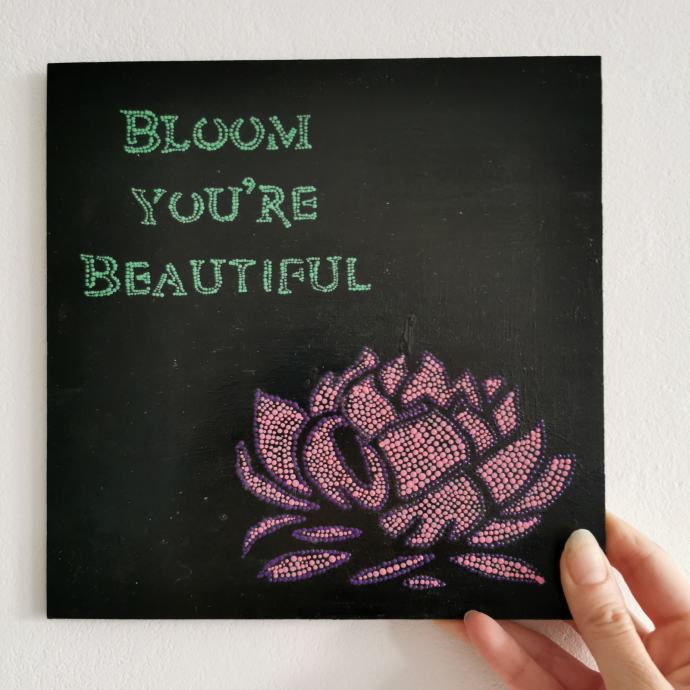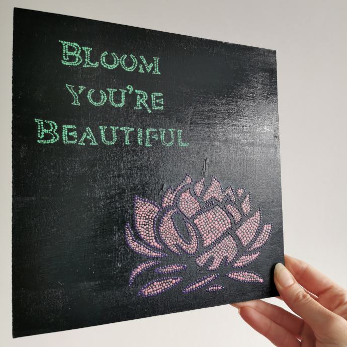 Slika rozi lotus I zelena poruka: Bloom you're beautiful na crnoj podlozi.
