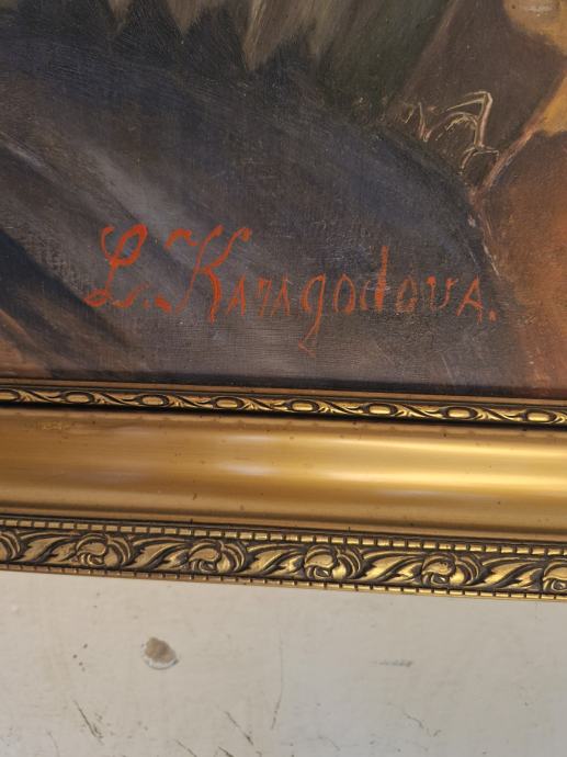 Antikna umjetnička slika velikih dimenzija, stare Ruske slikarice Ludmile Karagodove rađene stilom ulje na lesonitu. Slika je uramljena i opremljena te spremna za na zid. Veliki raritet i vrlo povoljna cijena.
