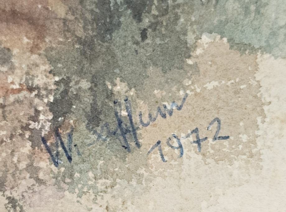 Akvarel iz 1972. godine donosi atmosferičan prikaz mediteranske obale s borovima u prvom planu i razvedenom morskom linijom u daljini.