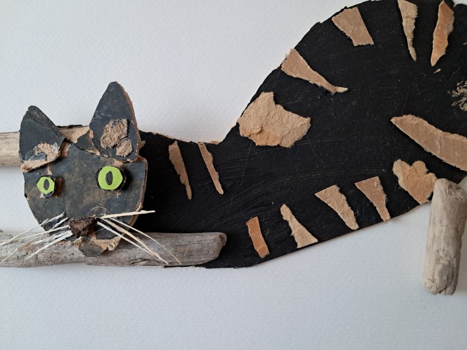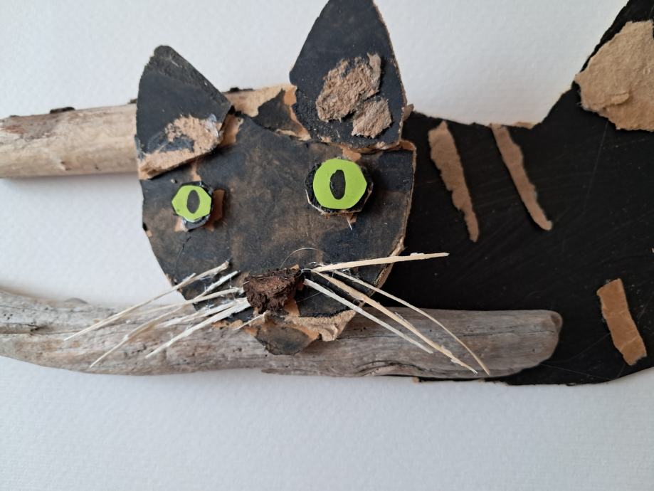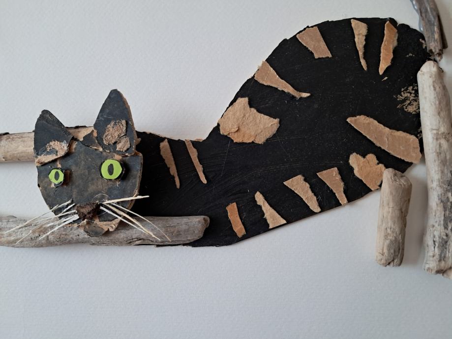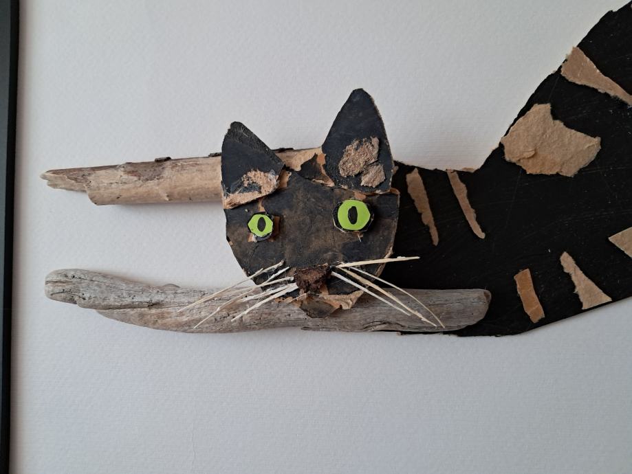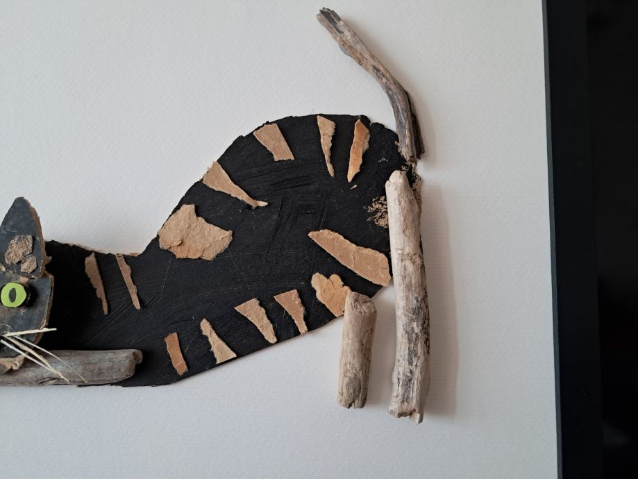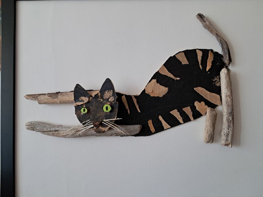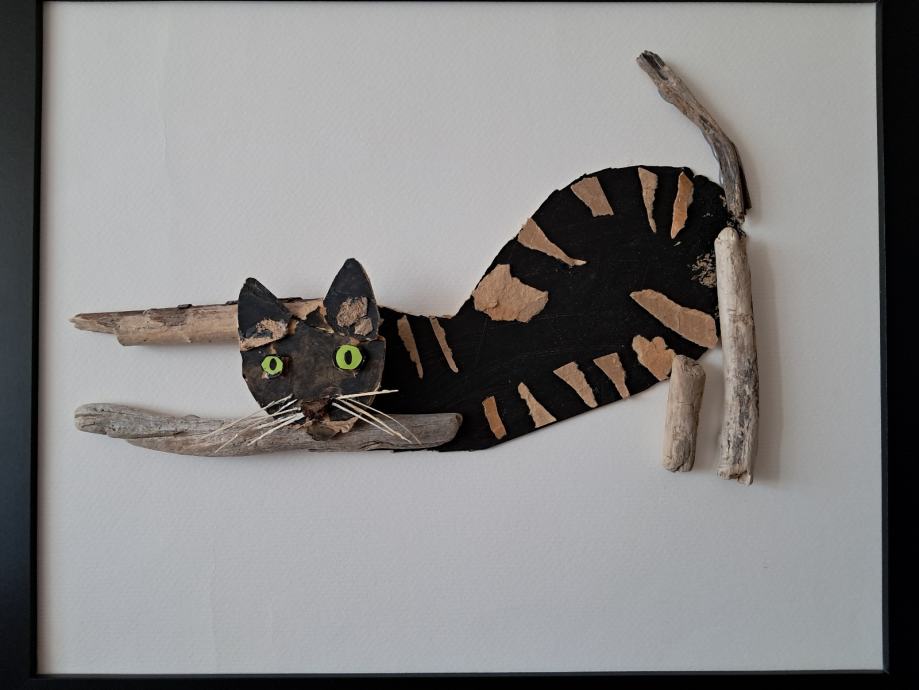 Ova lijepa slika izrađena je od naplavina pronađenih uz more i dodataka.Zajedno, nastala je mačka koja se rasteže.Dimenzija slike je 54 × 45 cm.