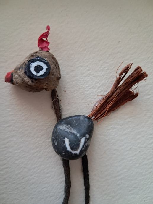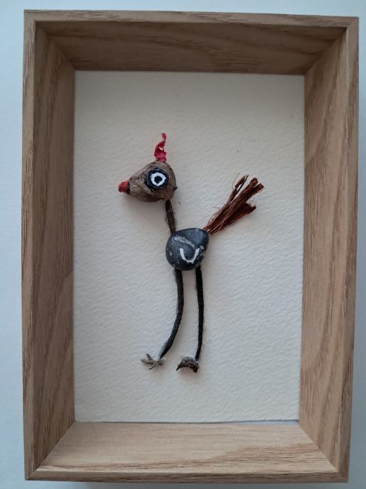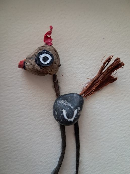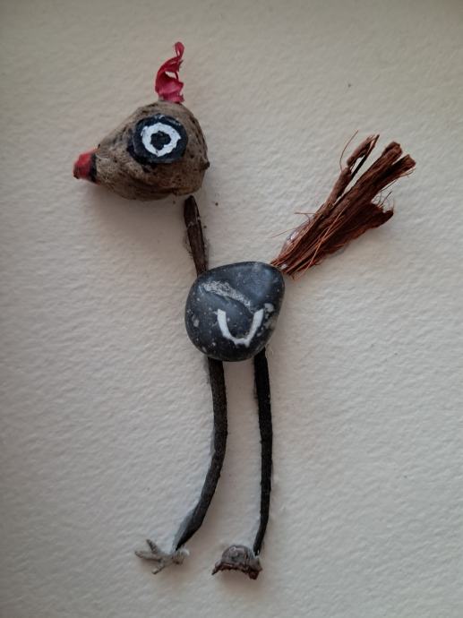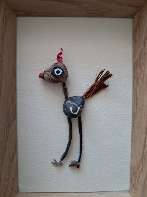 Ova mala ptičica izrađena je od komadića naplavina i kamenčića sa originalnom šarom u obliku krila.Uz dodatak detalja nastala je ova mala simpatična ptičica.Dimenzija slike je 17 × 12 cm.