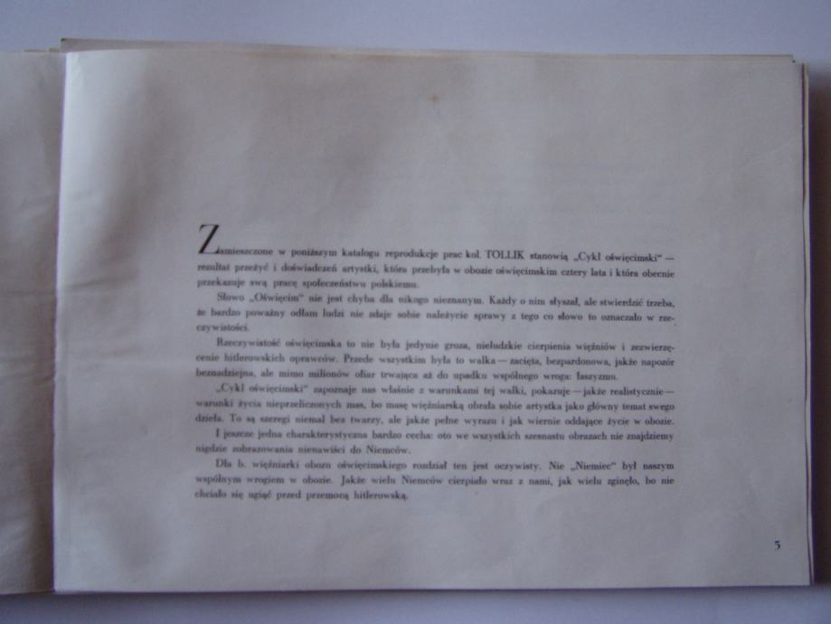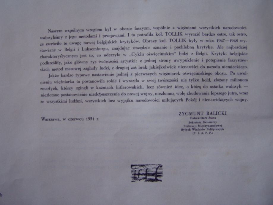 Janina Tollik rođena je 1910. u Janówu (županija Kwidzyń). U godinama 1931-1935 studirala je na Akademiji likovnih umjetnosti u Krakowu. Nakon izbijanja rata radila je u Pomeraniji kao medicinska sestra. Nakon deportacije u Krakow nastavila je raditi, zaposlila se i kao ured i tehničku pomoć u Uredu za upravljanje vodama u Krakowu. Tamo je osnovala tajnu informacijsko-obavještajnu jedinicu. Gestapo ju je uhitio u svibnju 1941. Nakon okrutne istrage u zatvoru Montelupich i nakon boravka u zavodu Helclów u Krakówu, zatvorena je u logor Auschwitz kao politička zatvorenica (u travnju 1942.). Janina Tollik je u Auschwitzu vrijedno radila u mnogim komanadama, uklj. u kaznenom društvu. Upravo je u kaznenom društvu počela skicirati razne prizore iz logorskog života. Tada je sve više crtala, slikala je i akvarelima. Uništila je mnoga djela, vodeći računa o tome da ih nitko ne treba. U listopadu 1944. poslana je u evakuacijskom transportu u KL Flossenbürg u Bavarskoj. Tamo je doživjela oslobođenje. U godinama 1945-1949 boravila je u Belgiji, gdje se liječila, studirala i radila. Godine 1949. vratila se u Poljsku. Umrla je 1994. u Varšavi. Konzentrationslager Auschwitz, KL Auschwitz (Stammlager), uključujući KL Birkenau (Auschwitz II) i KL Monowitz (Auschwitz III) - kompleks njemačkih nacističkih koncentracijskih logora, uključujući logor za istrebljenje u Oświęcimu i obližnjim gradovima, koji je postojao 1940.-1945. holokausta. Poznata i kao "tvornica smrti". Jedini koncentracijski logor na UNESCO-vom popisu svjetske baštine nosi službeni naziv Auschwitz-Birkenau. Njemački nacistički koncentracijski logor i logor istrebljenja (1940.-1945.). Imena Auschwitza, Birkenau i Monowitz njemački su ekvivalenti poljskih imena Oświęcim, Brzezinka i Monowice, korištenih nakon njemačke agresije na Poljsku 1939. i aneksije ovih zemalja od strane Trećeg Reicha. Oświęcim je Hitlerovim dekretom od 8. listopada 1939. inkorporiran u sastav Trećeg Reicha i administrativno se našao u Njemačkoj, u okrugu Bielsko (Landkreis Bielitz), okrugu Katowice (Regierungsbezirk Kattowitz), pokrajini Gornje Šleske (Provinz Oberschlesien). Godine 1940. njemačke vlasti su na ovim područjima osnovale logor, u početku namijenjen zatočenju političkih zatvorenika i oporbe, uglavnom Poljaka. Zatim je postupno proširen u glavno mjesto za masovno istrebljenje otprilike 1,1 milijun Židova iz cijele Europe, kao i 140-150.000 Poljaka, otprilike 23.000 Roma, otprilike 12.000 sovjetskih ratnih zarobljenika i žrtava drugih nacionalnosti. !