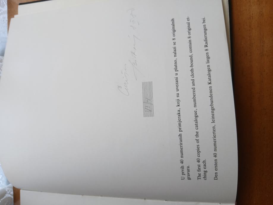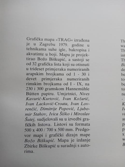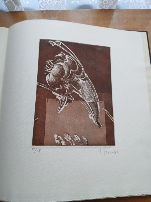 ČITAJ OGLAS !!! Mapa grafika zbirka Biškupic Izdana 1979 predstavljena javnosti 1980 te u galeriji Spektar.26,5x24,5 cm 400 stranica (ne računajući pripadajuće grafike)32 grafička lista numerirana rimskim brojevima i 9 listova numeriranih rimskim brojevima,potpisani od navedenih umjetnika:Nives Kavuric Kurtovic,Ivan Kožaric,Ivan Lackovic Croata,Ivan Lovrenčic,Dimitrije Popovic,Ljubomir Strahov,Ivica Šiško i Miroslav Šutej,potpis Bože Biškupica u impressumu.Dakle 9 originalnih potpisanih gravura uvezanih u navedenu mapu.Mapa je jedan od 40 primjeraka uvezanih u platno.Bez ikakvih oštećenja. Zadnja cijena je ta koja piše ispod oglasa.Osobna primopredaja (u rukavicama)eventualno dogovor oko preuzimanja.