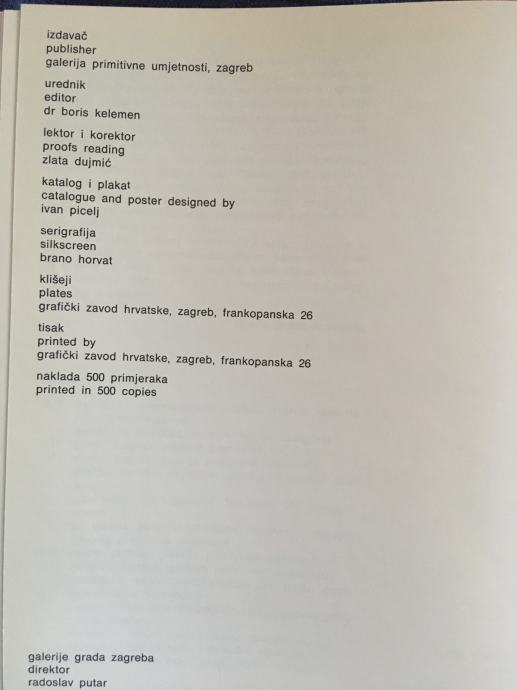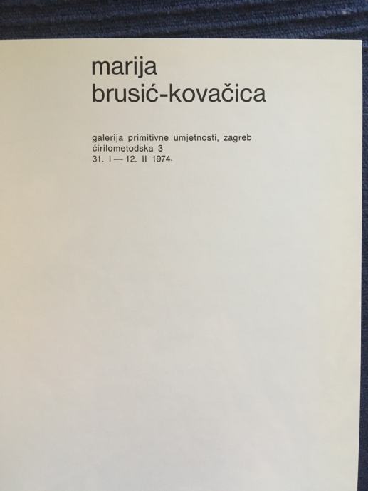 Nepotpisana originalna serigrafija poznate hrvatske akademske slikarice Marije Brusić - Kovačice, koja je bila dio kataloga izložbe održane u Galeriji primitivne umjetnosti u Zagrebu, 1974.g. Katalog je izdan u 500 primjeraka (tiskan u Grafičkom zavodu Hrvatske), a serigrafija je rađena u čuvenom studiju Brane Horvata, u kojemu su svoje grafike radili gotovo svi najznačajniji hrvatski umjetnici druge polovice 20. stoljeća. Dimenzije serigrafije su cca 21x20cm.