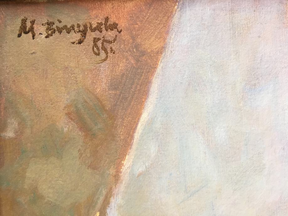 Ulje na latnu (kaširano na karton) iz 1985.g. poznatog hrvatskog slikara Marijana Bigule. Motiv je mrtva priroda. Uokvireno u tanki drveni okvir. Dimenzije s okvirom su 48x40cm.