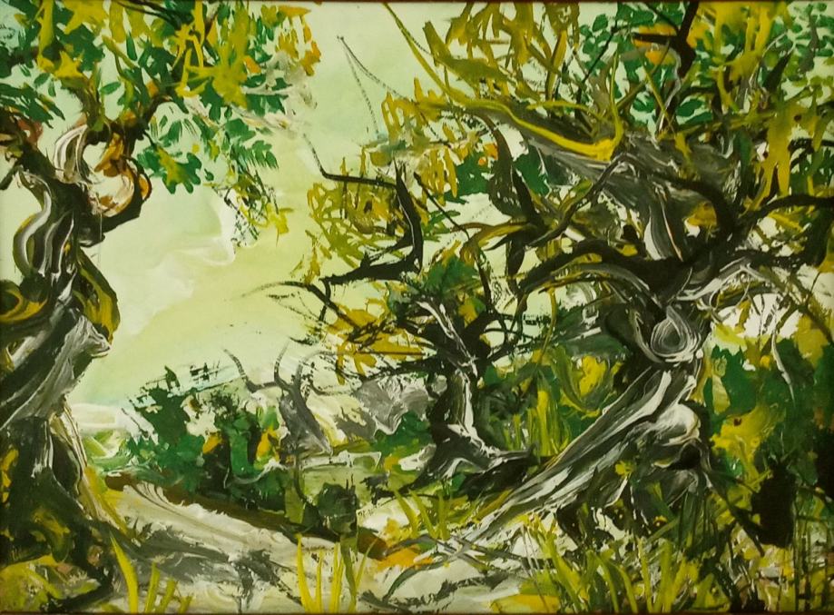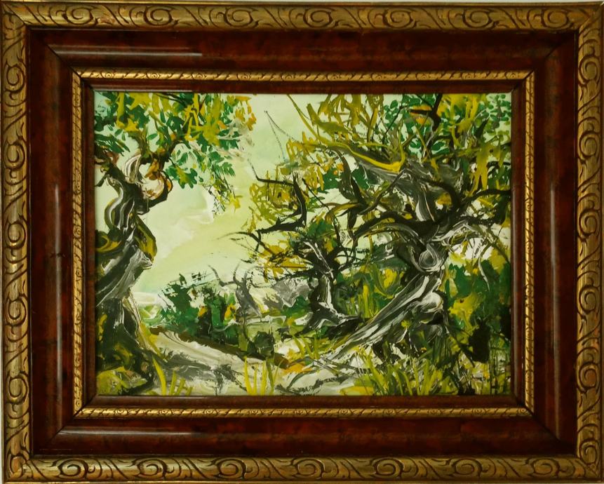 stara slika, akril na lesonitu u masivnom rustik okviru 64x53 / 46x35 cm