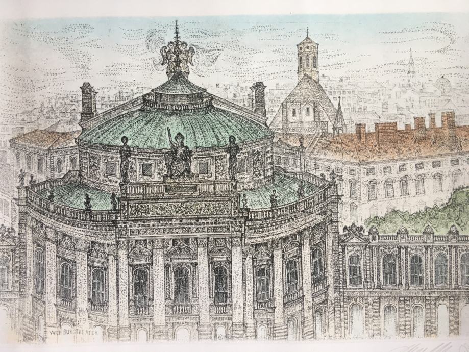 Motiv grafike je Burgtheater (Dvorsko kazalište) - jedna od znamenitosti na bečkom Ringu i jedna od najcijenjenijih pozornica njemačkog govornog područja. Nalazi se u samom središtu Beča u neposrednoj blizini gradske vijećnice te zgrada austrijskog Parlamenta i Bečkog sveučilišta. Kazalište se izvorno nazivalo k.k. Theater nächst der Burg, te kasnije k.k. Hof-Burgtheater do 1918. godine. Stara zgrada kazališta nalazila se na Michaelerplatz-u, u kojoj je zadnja predstava izvedena 12. listopada 1888. godine. "Novi" Burgtheater na Ringu nasuprot gradske vijećnice sagradili su u neobaroknom stilu Gottfried Semper (tlocrt) i Karl Hasenauer (pročelja). Izgradnja je započela 16. prosinca 1874. i protegnula se na dugih 14 godina, tijekom kojih se arhitektonski dvojac razišao. Poznati bečki slikar Gustav Klimt zajedno je s bratom Ernstom Klimtom i Franzom Matschom oslikao stropove novog kazlišta u godinama između 1886. i 1888.