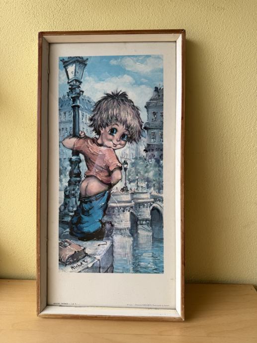 Raritetna Vintage uokvireno dimenzije 39 cm x 20 cm. Originalnvintage reprodukciju (tisak na kartonu) poznatog francuskog umjetnika Michela Thomasa. Riječ je o kultnom motivu "Le Pisseur" (Dječak koji piški) iz njegove serije pariških uličnih mangupa s velikim očima (Poulbots).
