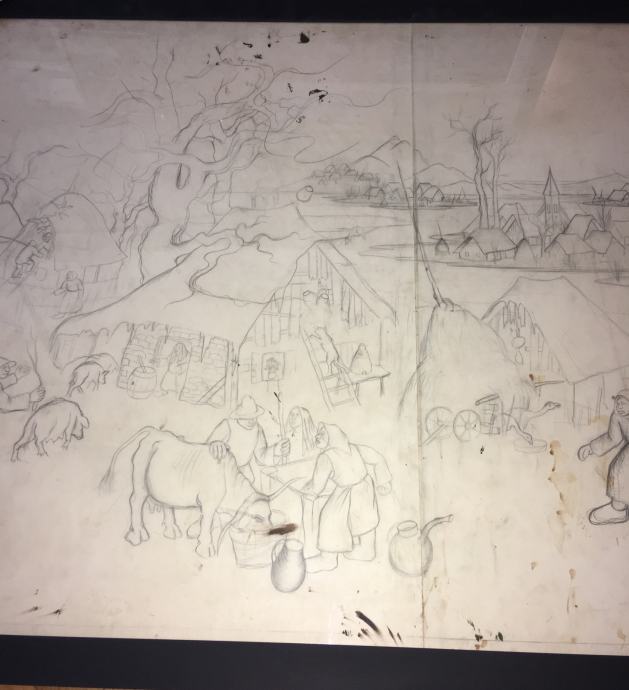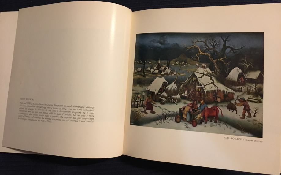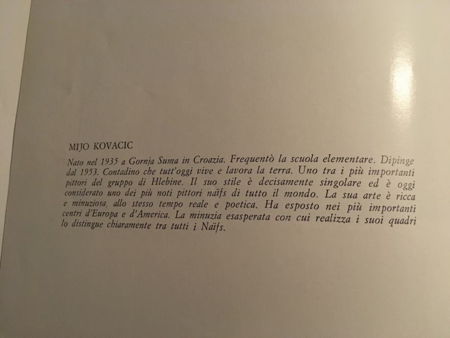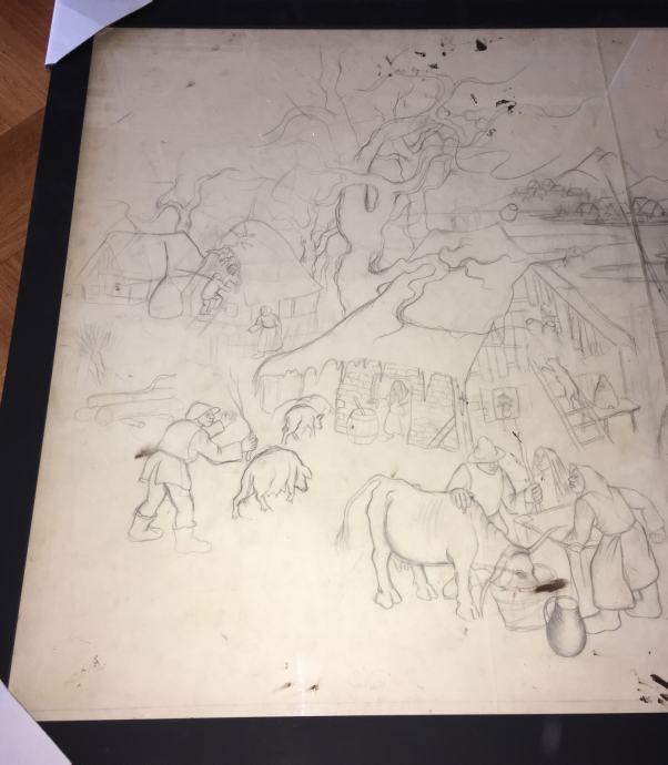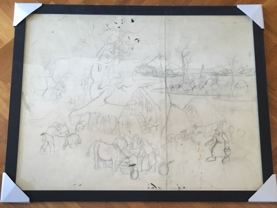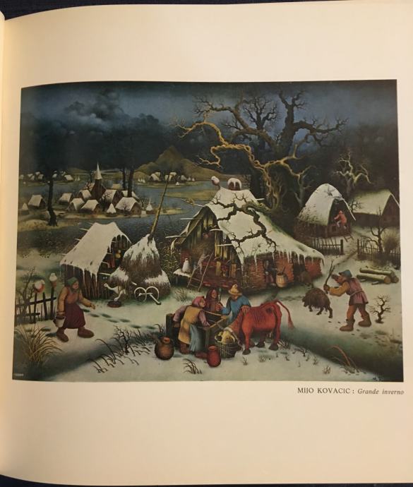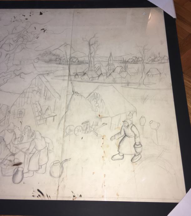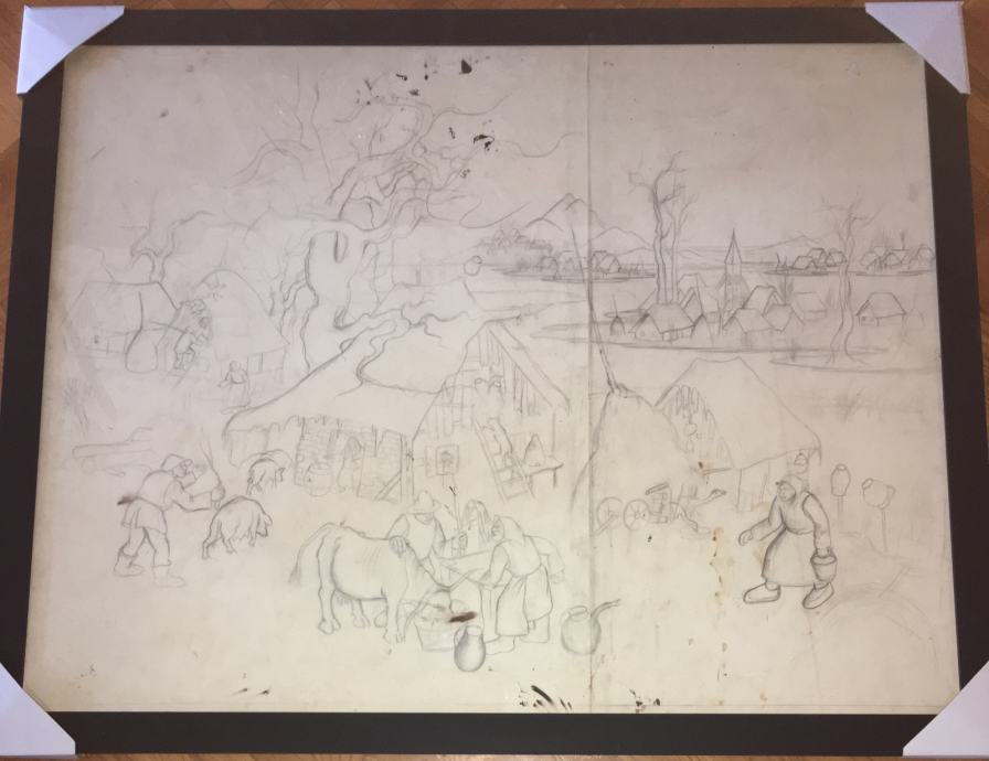 Veliki originalni crtež olovkom čuvenog hrvatskog slikara naive Mije Kovačića. Crtež je bio predložak / podloga za poznato ulje na staklu koje je bilo izlagano na izložbi jugoslavenskih naivnih slikara održanoj u Veroni 1975.g. Uz sliku ide i talijanski katalog izložbe u kojemu je reproducirana ta slika (vidi fotografije). Orignalni rad je također reproduciran na naslovnici kalendara izdanog uoči Zimskih olimpijskih igara u Sarajevu, 1984.g. (vidjeti fotografije). Crtež je galerijski uramljen i ostakljen. Dimenzije s okvirom su cca 120x100cm. Na crtežu je nekoliko mrlja od boje, pretpostavljam nastalih tijekom slikanja na staklu.