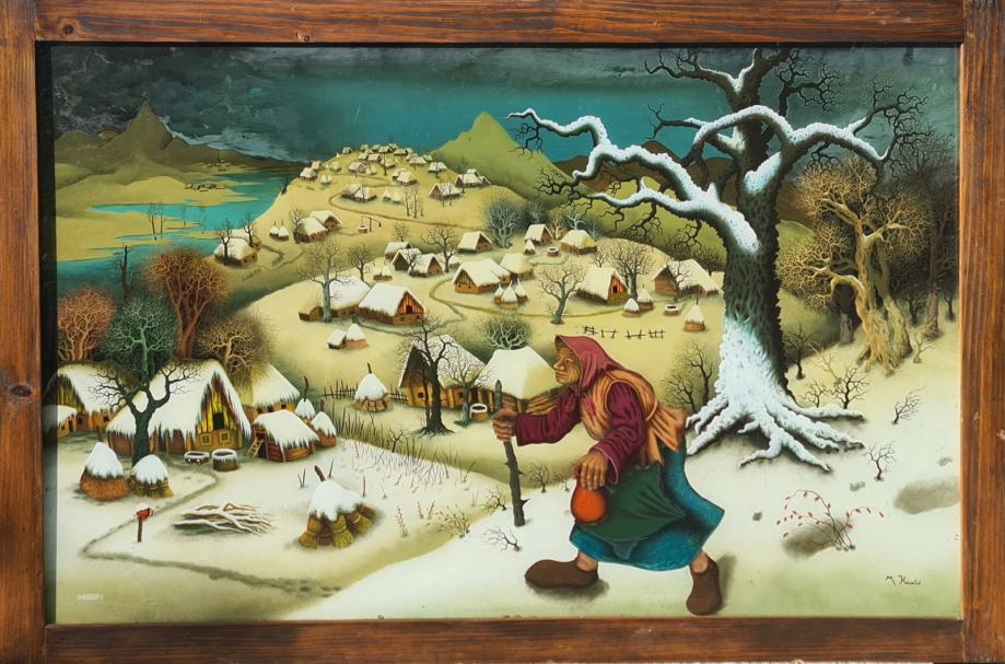 Mijo Kovačić "Selo zimi" ulje na staklu 123x78cm; iz 1965 godine;
