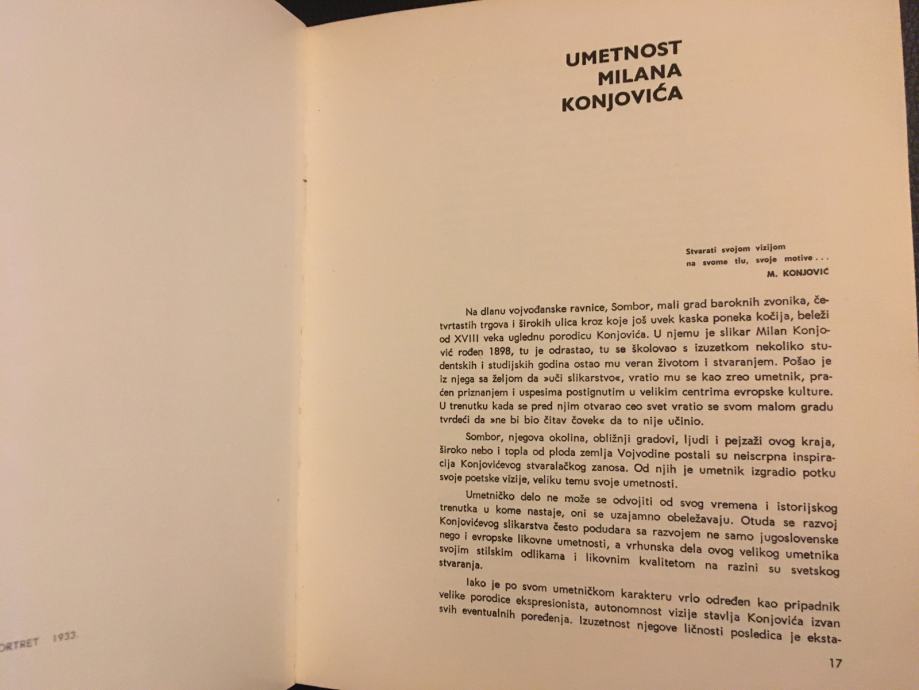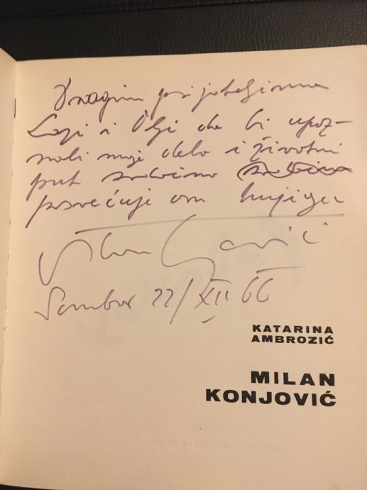 Potpisana monografija iz 1966.g. čuvenog srpskog slikara MIlana Konjevića. Potpis i posveta su iz 1966.g. Izdanje Galerija Milan Konjović, 234 str.