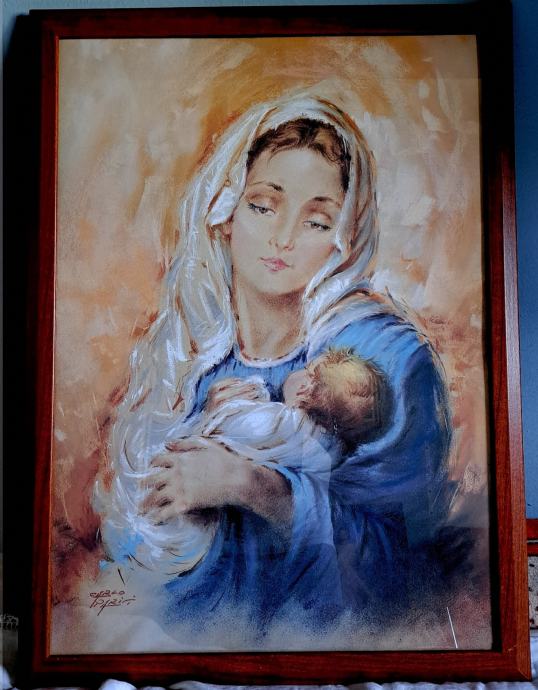 Dvije slike Milosrdni Isus, dimenzije sa okvirom 53x74 cm i Gospa sa Isusom, dimenzije sa okvirom 55x72 cm. Drveni okvir. Jedna slika 50 eura.
