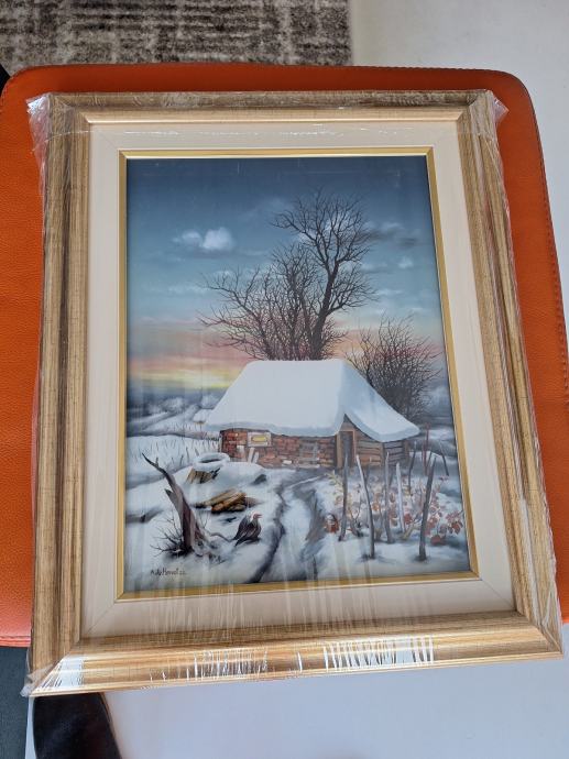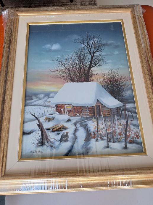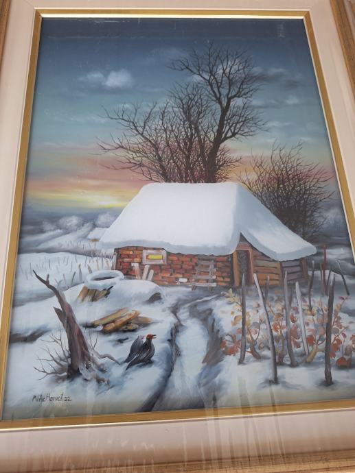 Ulje na staklu poznatog slikara naive Mirka Horvata . Samo staklo 40×30, sa okvirom 55×45. Zimski motiv kleti vrhunski i novo opremljena.