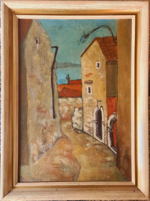 Miron Makanec "Stare kuće na otoku Ižu" ulje na drvetu 70x50cm; oko 1960. godine;