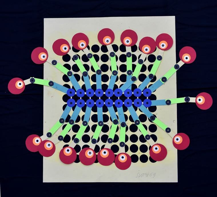 Miroslav Šutej "Instalacija" mobilni kolaž 55x55cm; iz 1969. godine;