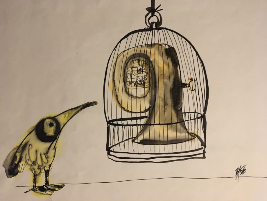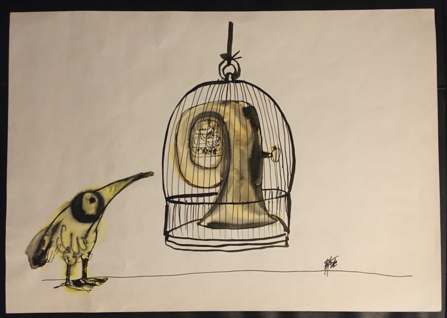 Crtež tušem - karikatura poznatog hrvatskog crtača i karikaturiste Mladena Bašića Bibija. Dimenzije 50x35cm.
