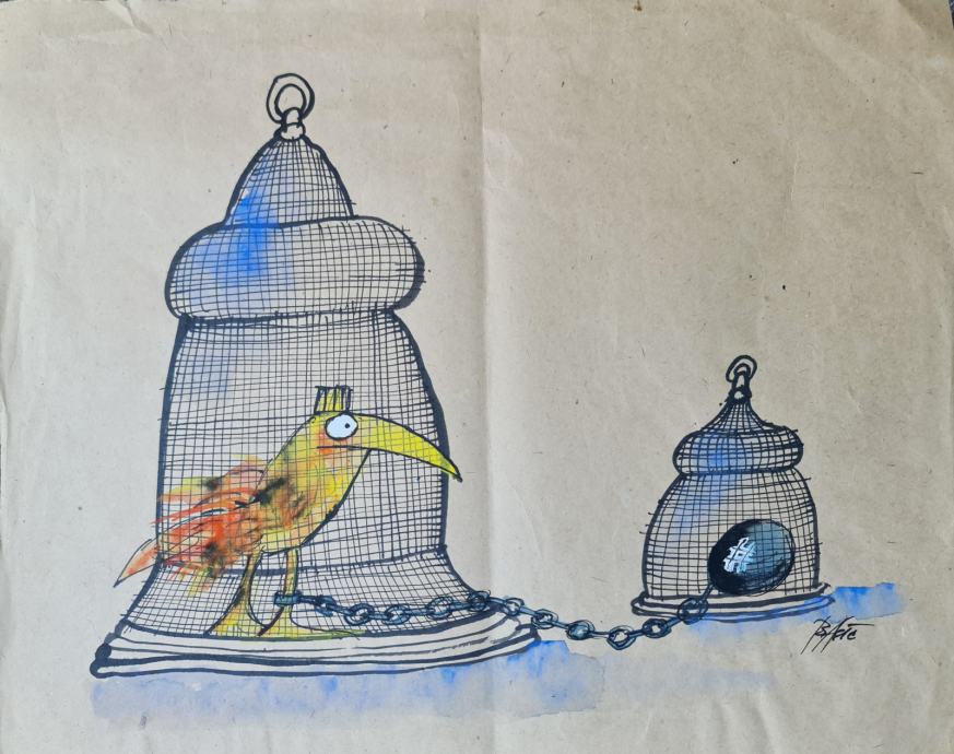 Mladen Bašić Bibi "U zatvoru" tuš akvarel strip 30x40cm; oko 1980.god;