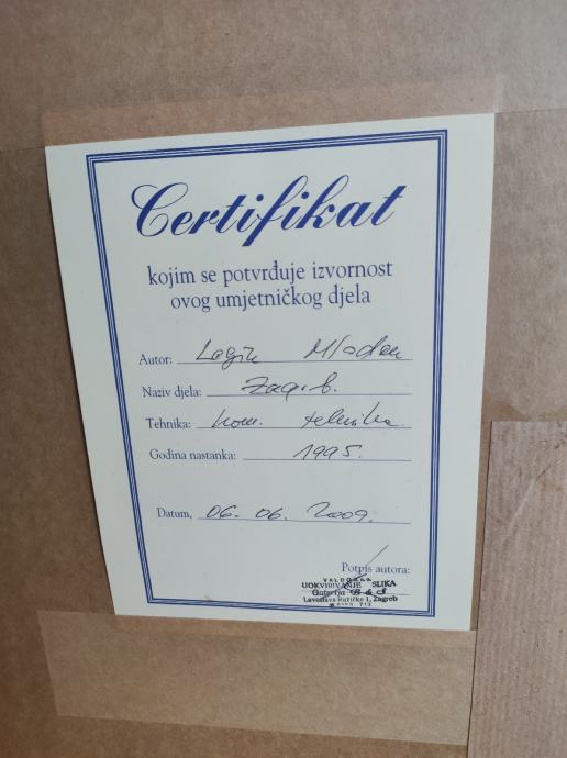 Umjetnička slika sa certifikatom, kombinirana tehnika. 61x40. Uokvirena 82 x 61,5 cm. Akademski slikar Mladen Legin rođen je 1949.g. Diplomirao je slikarstvo i grafiku na Akademiji likovnih umjetnosti u Zagrebu. Sudjelovao je na većem broju skupnih izložbi.