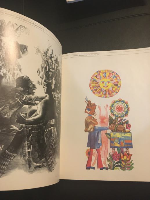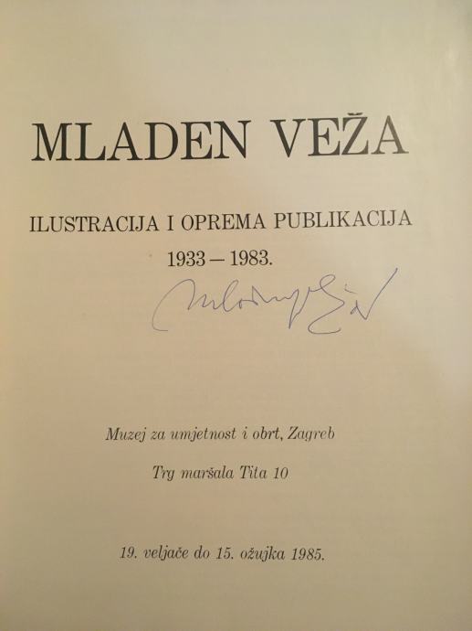 Potpisani katalog izložbe iz 1985.g. čuvenog hrvatskog akademskog slikara Mladena Veže. Izložba održana u MUO Zagreb, naziv "Ilustracija i oprema publikacija 1933-1983", dimenzije 30x24cm, 48 str.