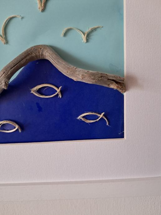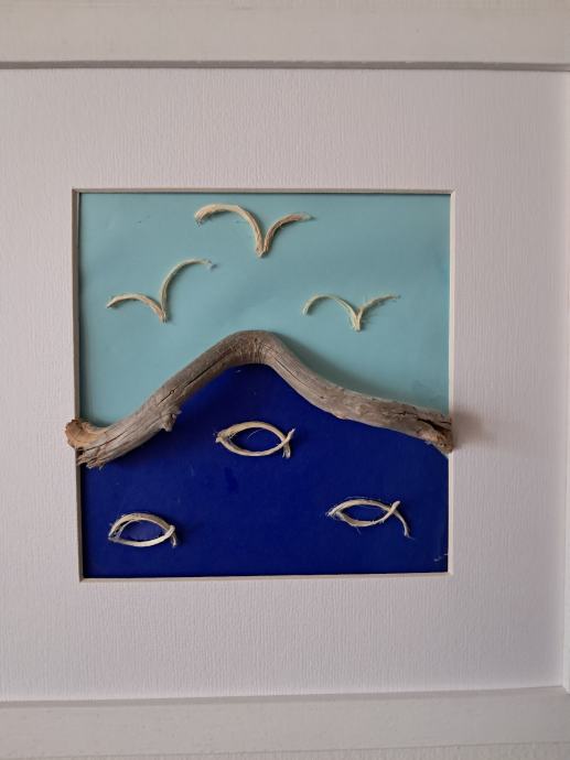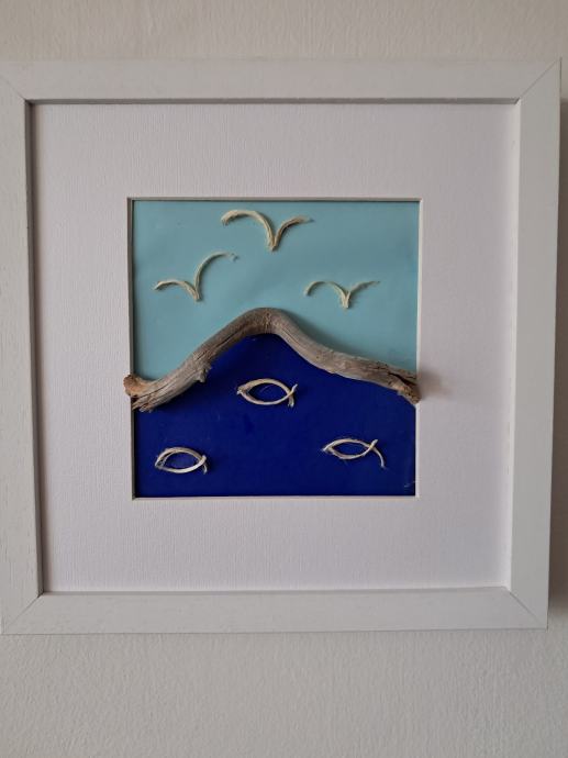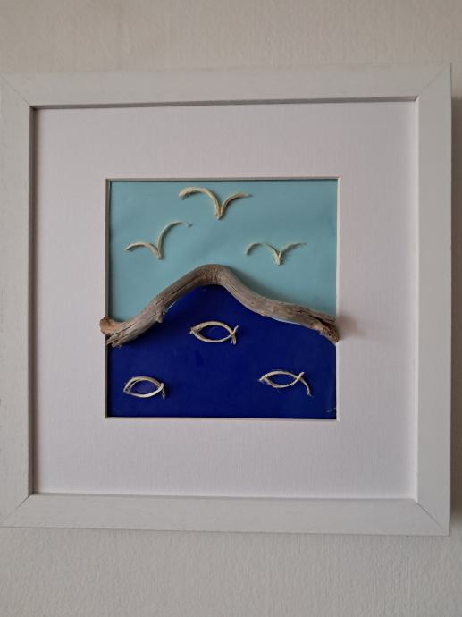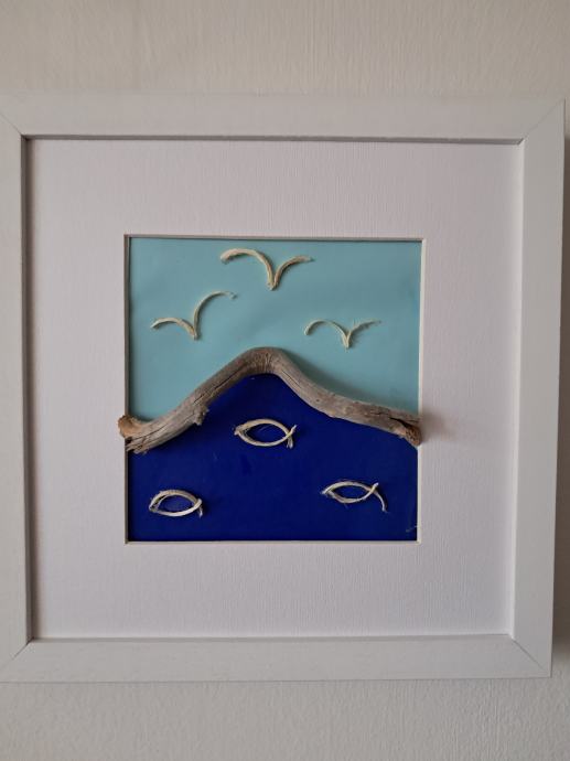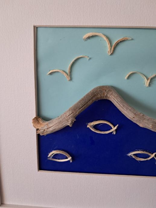 Ova jedinstvena slika izrađena je od morskih naplavina.Svojim oblicima dočarava nam val , galebove i more. Sa originalnim okvirom dimenzije slike su 27 × 27 cm.