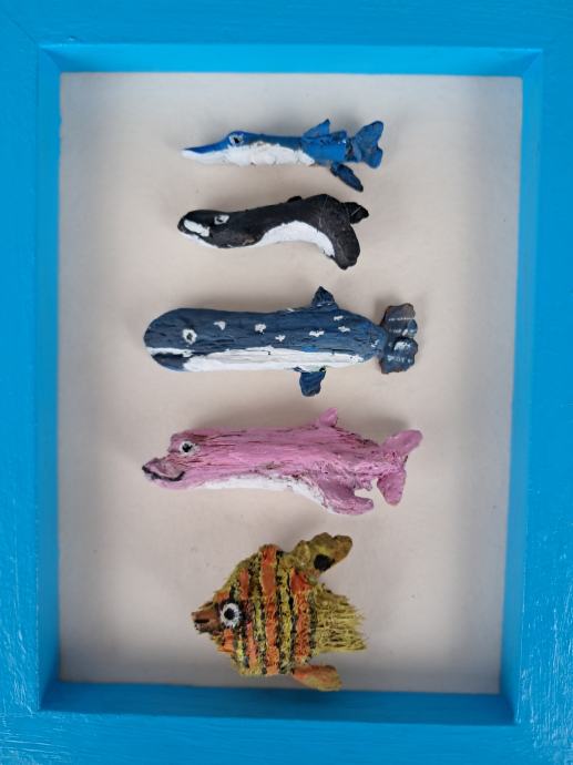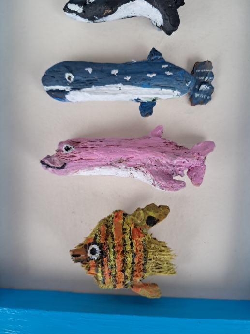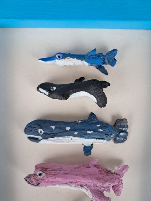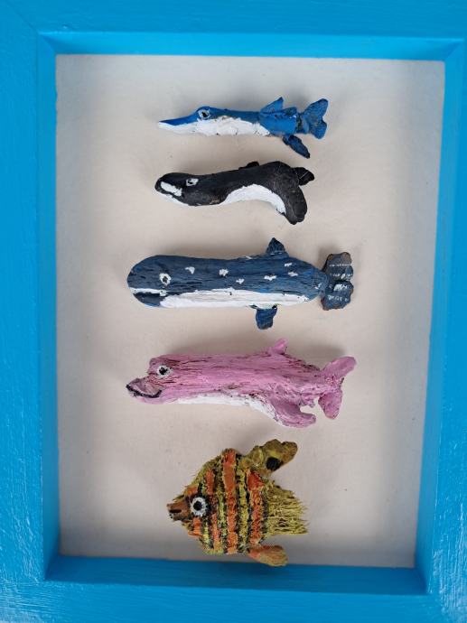 Ova simpatična sličica izrađena je od jedinstvenih komada morskih naplavina, koje uz dodatak mašte i boja predstavlja ovo veselo morsko društvo.Dimenzija slike je 17,5 × 23 cm.