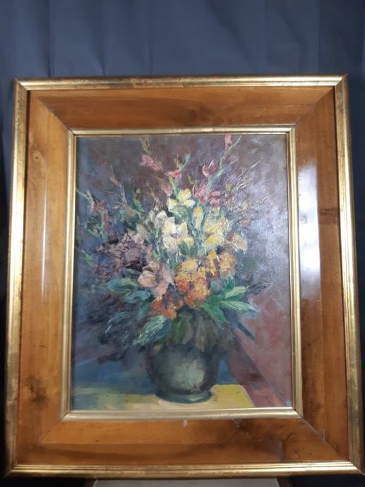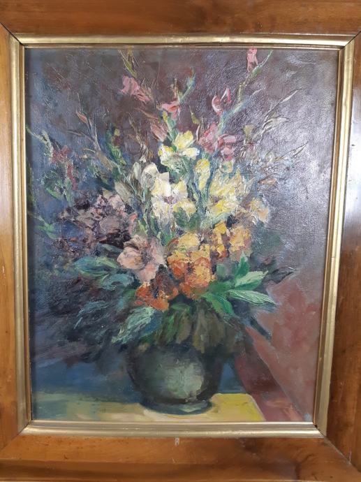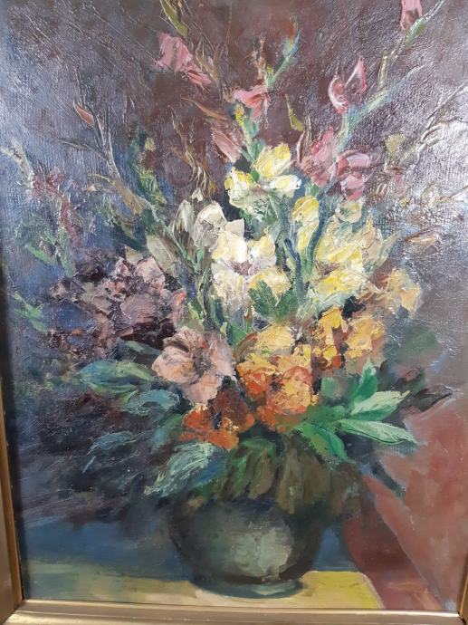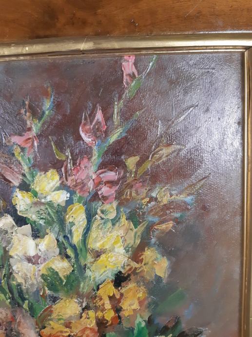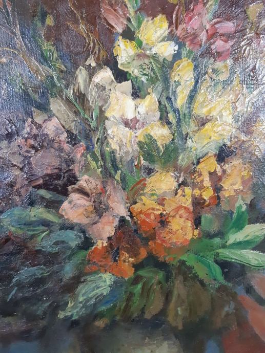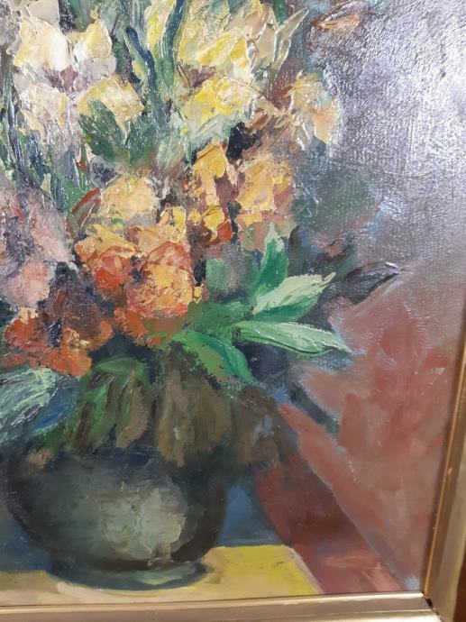 Velika slika mrtve prirode sa cvijećem u vazi,slika je nepotpisana te rađena tehnikom ulja na kartonu,dimenzije slike su 51x64cm sa okvirom 63x98cm