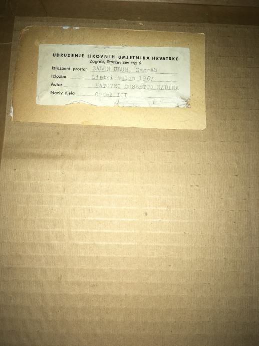 Nadina Cossetto Vatovec – Crtež sa izložbe Ljetnog salona ULUHA iz 1967.g. , dimenzije 192. Nadina Cossetto Vatovec – Crtež sa izložbe Ljetnog salona ULUHA iz 1967.g. , dimenzije 45x36cm (unutar paspartua 28x24cm). Nadina Vatovec rođena je 5. rujna 1925. u Samoboru. Diplomirala je na Akademiji likovnih umjetnosti u Zagrebu 1950., u klasi profesora M. Detonija, a slikarsku specijalku završila je 1952. godine. Prvi puta izlaže 1955. godine na XI izložbi udruženja likovnih umjetnika hrvatske u Zagrebu (Umjetnički paviljon). Izlagala je i na brojnim samostalnim i skupnim izložbama. O njoj su pisali najznačajniji likovni kritičari na ovim prostorima. Preminula je 2006.g