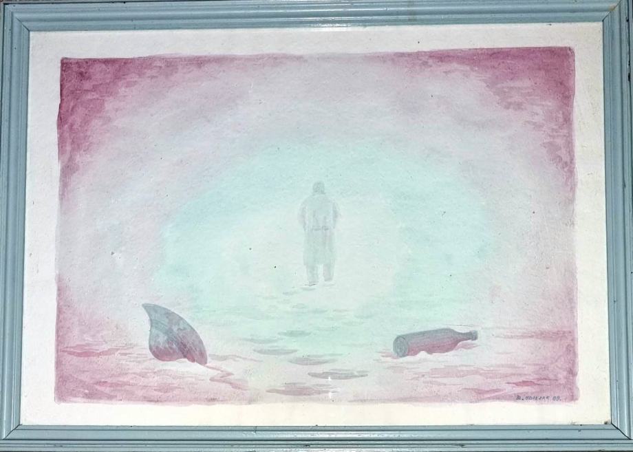 14)Branimir Udiljak,"Odlazak", uramljeni akvarel 50×35 cm 1988 g potpisan - was born November 17, 1945 in Varazdin, in Hrvatsko Zagorje. Painted in 1968, in a classic of Hlebine school , but over time , living in Zagreb , abandons hispoetic version of Hlebine school , finding a new path in the so-called naiveart, urban ,in whichthe world is looking for his poetic and lyrical . He made his first solo exhibition in Zagreb. Since then exhibited in many solo exhibitions (in Trieste, Modena, Monaco, Turin, Helsinki, in San Remo, Bec, etc..) as well as in many group exhibitions (in Brussels in Munchen, in Bec, in Udine, Morges, Stuttgart, etc..) With his latest works he reaches the top urban Croatian naive art. He lives and works in Zagreb. ( preuzeto sa Croatin naive art)