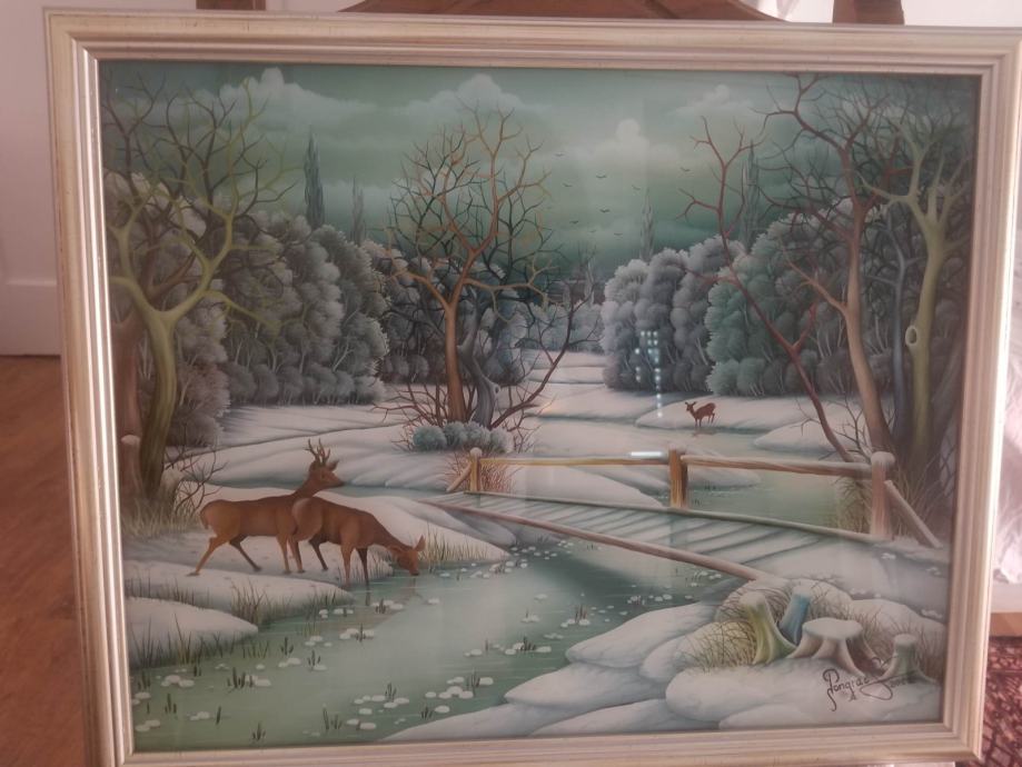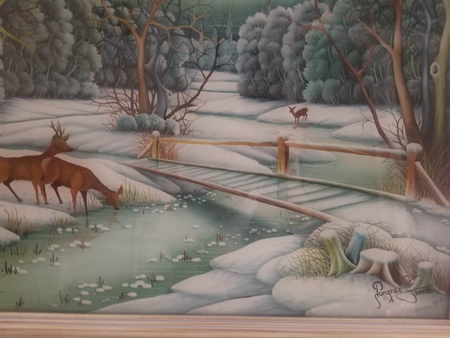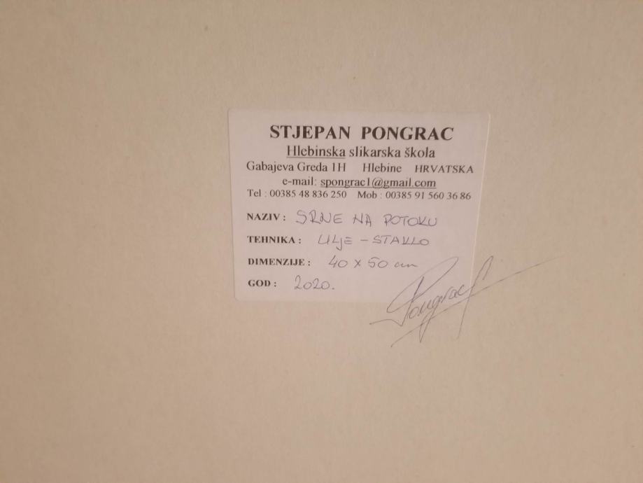 Povoljno: Original SRNE NA POTOKU (2020), STJEPANA PONGRACA, clana Drustva naivnih slikara (Hlebinska skola).