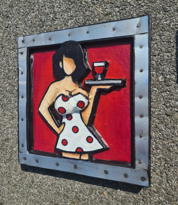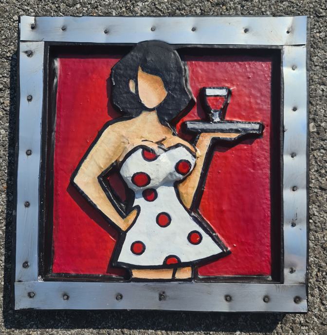 Nikolina Ivezić "djevojka s čašom vina" reljef lim ulje 25x25cm;