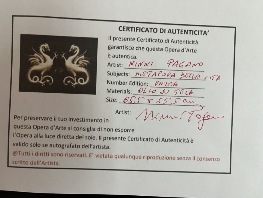 Ninni Pagano, ulje na platnu “Metafora della vita”, 65,5x65,5 cm. Sa potpisom i certifikatom.
