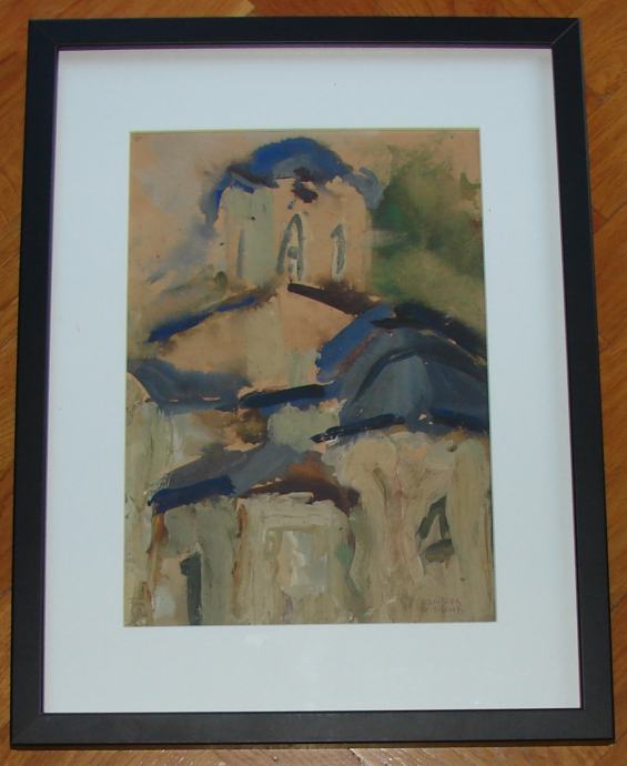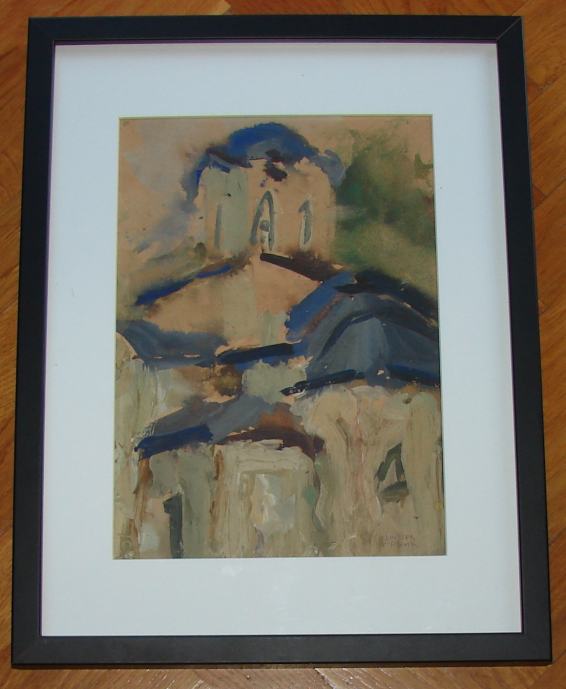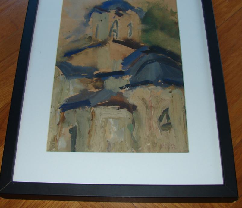Tempera / gouache na papiru poznate srpske akademske slikarice Olivere Grbić. Kvalitetno uramljeno i ostakljeno. Dimenzije slike s okvirom su 43x32cm (dimenzije unutar paspartua su 29x20cm). Sa stražnje strane papira je također nekakav crtež-studija sikarice.
