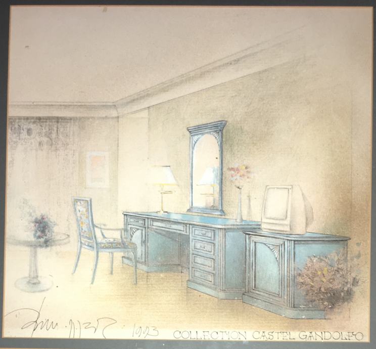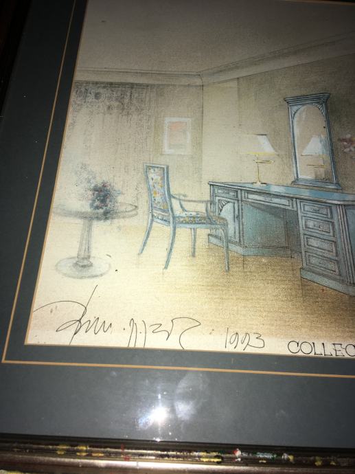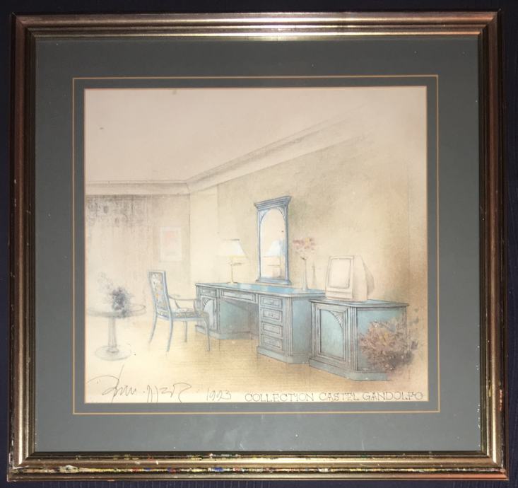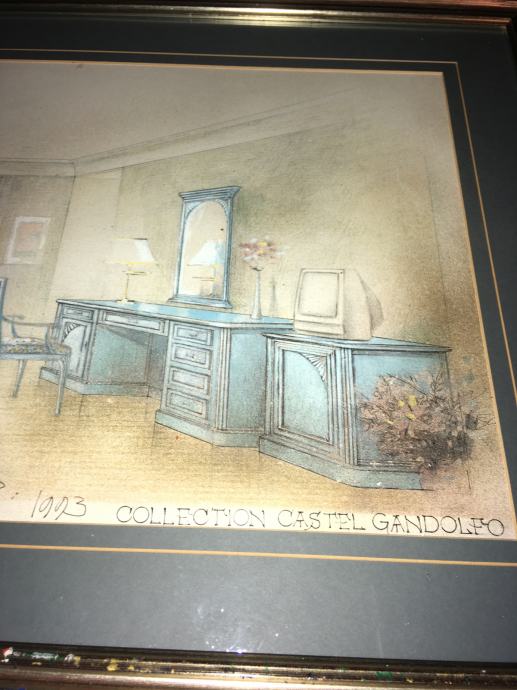 Crtež / skica interijera (kolekcija Castel Gandolfo) poznatog slikara i arhitekta Omera Berbera. Galerijski uramljeno i ostakljeno. Dimenzije slike s okvirom su 45x42cm (dimenzije unutar paspartua su 31x28cm).