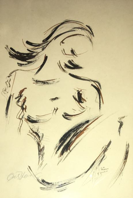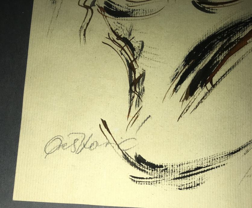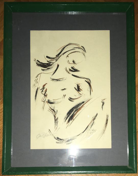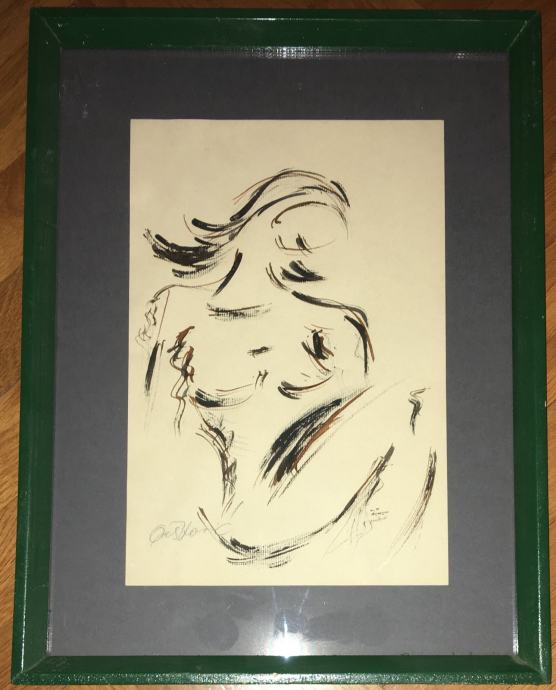 Crtež tušem s motivom ženskog akta slikara Oreškovića. Uokvireno i ostakljeno. Dimenzijes okvirom su 42x32cm (unutar paspartua 30x20cm).