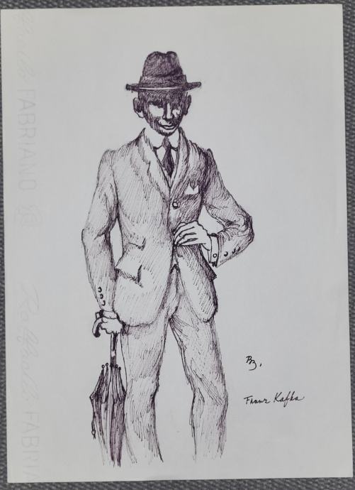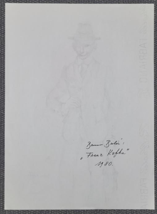 Bruno Bulić, dimenzije 24x33 cm, prikazuje portret poznatog književnika Franza Kafke. Skica je izrađena na visokokvalitetnom Fabriano papiru, što dodatno ističe njenu vrijednost i trajnost. Skica prikazuje Kafku u elegantnom odijelu s kišobranom, u prepoznatljivom, pomalo stiliziranom Bulićevom izrazu. Na poleđini rada naveden je naziv "Franz Kafka" i godina 1980., što potvrđuje autentičnost.