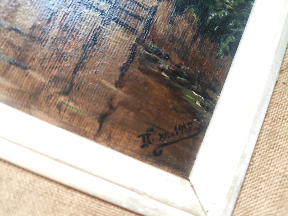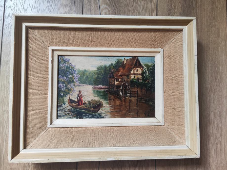 Prodajem originalnu, stariju uljanu sliku iz 1947. godine, s motivom riječnog mlina i čamca. Slika je potpisana (inicijali) i datirana (XII.1947.), rađena u tehnici ulja na platnu. U vrlo dobrom stanju, s originalnim drvenim okvirom klasičnog izgleda.