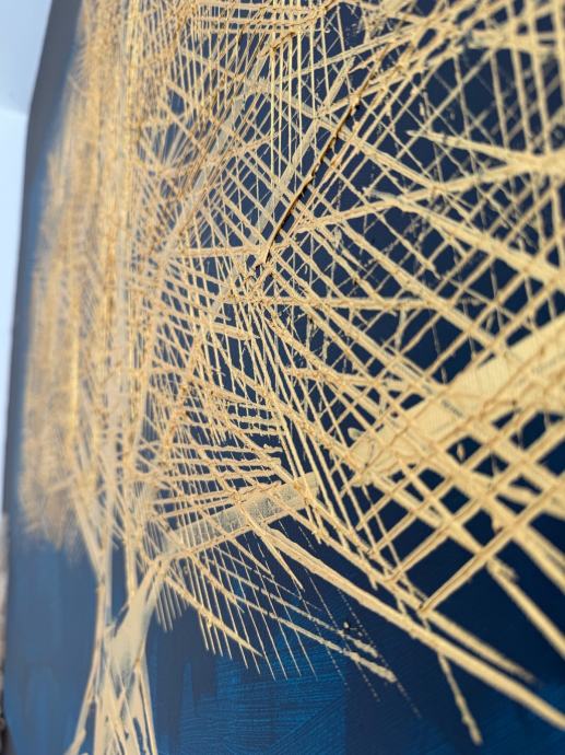 Motiv je apstraktno prikazano zlatno drvo na snažnoj plavoj pozadini.