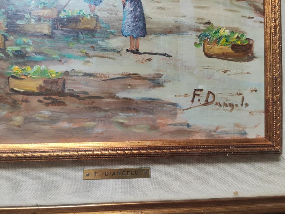 Prodajem originalnu uljanu sliku renomiranog talijanskog umjetnika F. D’Angelo. Dimenzije platna su 40x30 cm, a s drvenim, teškim okvirom ukupne dimenzije 73x57 cm. Slika prikazuje živopisnu uličnu scenu s detaljima tržnice u toplim bojama.