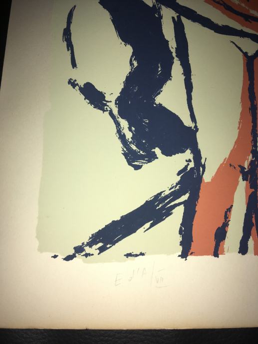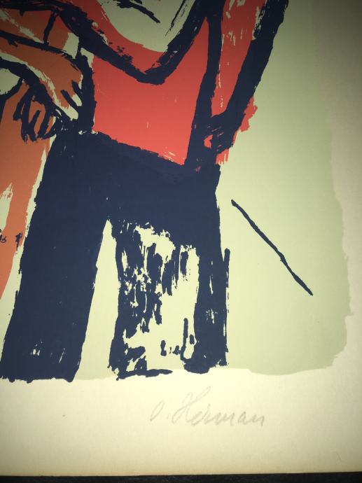 Potpisana i numerirana serigrafija iz 1959.g. jednoga od najvećih hrvatskih slikara, Oskara Hermana, izrađena u čuvenom studiju Brane Horvata. Dimenzije serigrafije su 50x35cm.